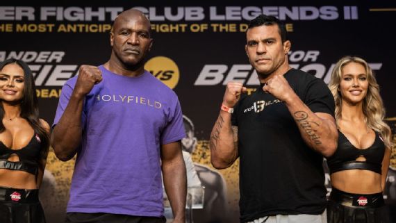 900 AM ET Mike CoppingerESPN Evander Holyfield will return to the ring Saturday against a legendary mixed martial artist former UFC light heavyweight champion Vitor. Evander Holyfield returns to the ring for the first time in a decade at the age of 58 to face off with Vitor Belfort in a pay-per-view boxing bout at the Hard Rock. Belfort who retired from the UFC after a knockout loss to Lyoto Machida in May 2018 has made just one professional boxing appearance.